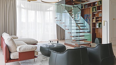 Комфорт—ключевая характеристика объекта, как в организации пространства, так и в художественном решении. Все проекты Марии Рублевой наполнены ощущением комфорта и уюта, именно этим дизайнер привлекла к себе внимание заказчиков, которые долго искали на просторах интернета и на страницах специализированных изданий профессионала для оформления своего пентхауса. И не прогадали с выбором! Интерьер полностью оправдывает ожидания: супруги и их трое детей получили желаемый уровень комфорта и тот образ жизни, на который рассчитывали. «Для владельцев было очень важно, чтобы интерьер не был банальным, при этом оставался бы актуальным в течение многих лет и отвечал всем потребностям семьи,—отмечает автор проекта.— Заказчик по роду своей работы очень много путешествует и проводит большую часть своего времени в отелях. Поэтому основной запрос звучал так: функциональный интерьер с техническими характеристиками, как в дорогом пятизвёздочном отеле, но при этом с уютной домашней атмосферой, а не обезличенное пространство, пусть даже и очень дорогое, стильное и дизайнерски продуманное». Интерьер напоминает добротный загородный дом: ставку дизайнер сделала на дерево и камень с грубыми натуральными текстурами, напоминающими известняк и сланец, а не на мрамор или керамогранит под мрамор с классическим рисунком, которые сейчас очень популярны и используются во многих интерьерах. Все предметы обстановки подбирались при непосредственном участии заказчика, который лично тестировал каждую вещь на тактильность и удобство (особенно это касалось мягкой мебели). На должном уровне и техническая начинка. Интерьер наполнен различными системами умного дома, которые управляют всеми процессами в доме. «Этот проект в нашей практике был одним из самых сложных,—признаётся Мария.—Именно с точки зрения технической реализации нам пришлось прорабатывать многие моменты с инженерами, искать новые решения, внедрять новые технологии, но от этого работа стала только интереснее».